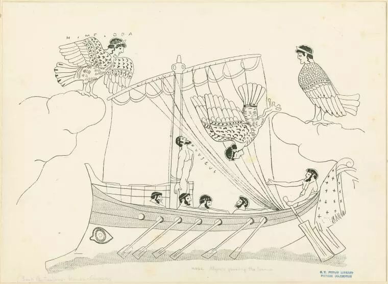 奥德修斯离开冥界作别瑟西,踏上了归途。在海上他遇到了能用歌声迷惑人使人往返的海妖塞壬姊妹(Sirens),他按照瑟西的警示用塞子封住船员的耳朵,却并不封住自己,而是用绳索将自己自己紧紧捆绑在船上。
