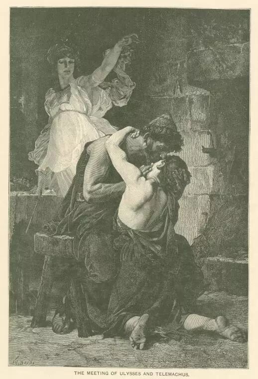 雅典娜(Athena)同情奥德修斯,来伊萨卡找到其子忒勒马科斯(Telemachus),让他出海寻父。忒勒马科斯从皮洛斯王涅斯托尔(Nestor)处得知父亲尚在人世。