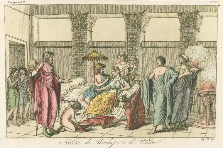 奥德修斯多年未归,人们以为他已经不在人世,络绎不绝的觊觎王位者来到伊萨卡求娶他的妻子佩内洛普(Penelope)。