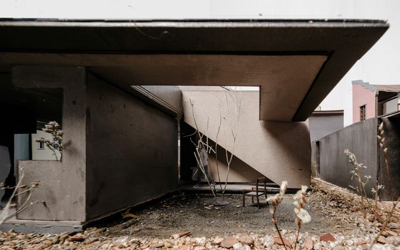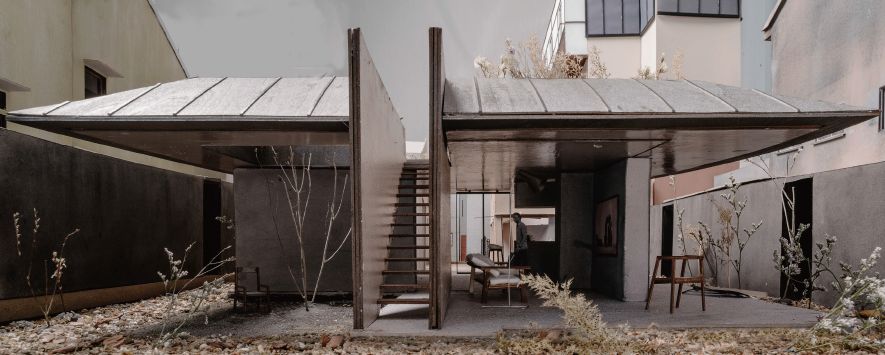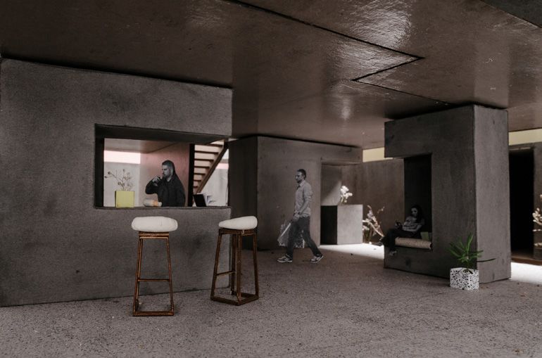 在第二轮的草案迭代中,前稿中限定空间边界的柱列改为框景门洞,以增加内外动线和视线的张力。但这一改动的空间结构中,较小的室内空间及狭窄的外围走廊仍无法很好地满足公共活动需求。另外,方案打开了空间的一角,并置入树木以营造场地氛围。在进一步的迭代后,方案做出了较大的改动,原有框架结构被取消,改为由几个混凝土体块撑起屋顶,同时这些体块作为空间分隔要素,限定出不同的功能区域,也起到家具的功能,因而承重结构在空间感知中的占据感被弱化。体块的位置也经过反复推敲,形式与空间均做出了准确的控制 。