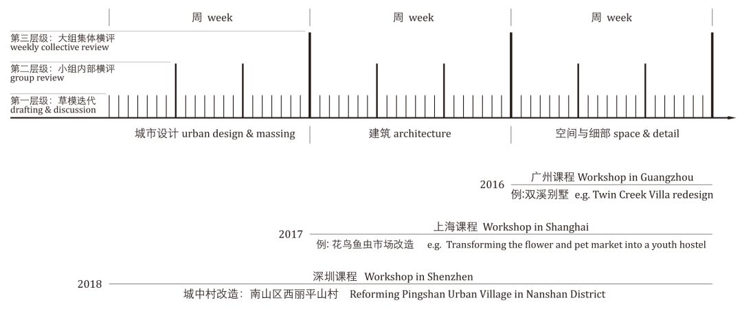 参考以科尔霍夫教授课程为例的设计课程设置,建筑工房通过三期课程的尝试,摸索出一种适应于一个较短训练周期内(2~4周),可积极迭代的三种反馈层级。