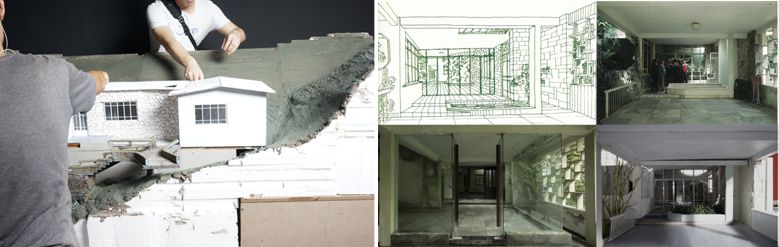 在第二年上海江阴路的题目中,一个废置的花鸟鱼虫市场需重新设计为青年旅馆,其中一组同学的任务是将场地中间有体量的院子改造为公共活动空间。