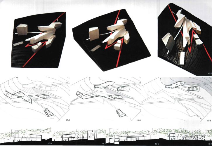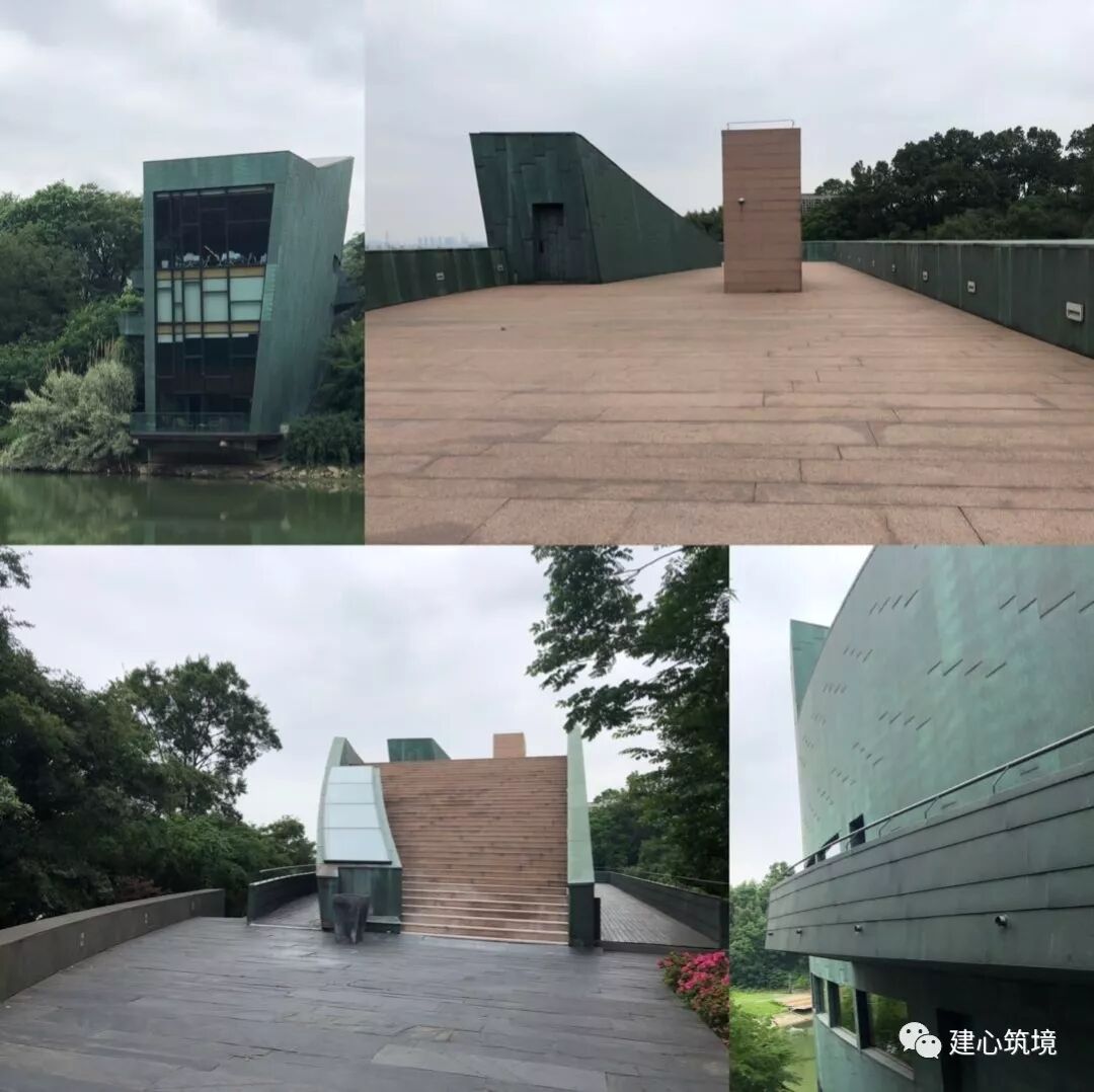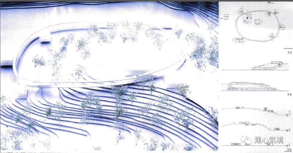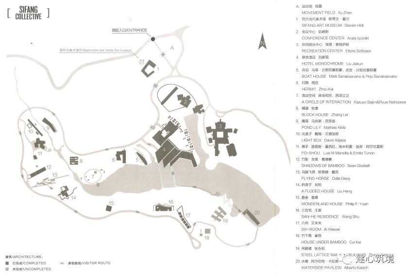 以建筑实物作为展品的展览自20世纪上半叶成为现代主义建筑实践探索的一种重要形式。代表案例有1927年德国斯图加特住宅展Weissenhofsiedlung “Die Wohnung”和1990年日本福冈NEXUS WORLD等。 近年来,长城脚下的公社、西北银川贺兰山房、金华建筑艺术公园、四川安仁博物馆群落等“集群式”项目在国内兴起。 与这些由出资方决策、集合建筑师的特定建设项目不同,建筑实践展更多地是针对存在的问题,预设目标主题,通过完整的策展机制,呈现预设的艺术、学术和社会意义。2002年10月,第四届上海双年展以“都市营造”为主题,首次将建筑列为主要内容,刘家琨、张雷、马清运等参展建筑师,国际策展人、建筑师矶崎新和国内资深艺术活动家、评论家许江、李小山、葛亚平等展开了系列讨论,对中国建筑的现状进行批判性反思,并萌生了从实践出发,以优秀的典型性建筑作品带动中国建筑发展的想法,由此形成了举办一次国际性建筑实践展的计划。2003年初,中国国际建筑艺术实践展(China International Practical Exhibition of Architecture, CIPEA)在南京正式启动,由文化部中国对外艺术展览中心和南京浦口区政府主办。矶崎新、刘家琨担任建筑策展人,许江和李小山担任艺术策展人。矶崎新邀请了具有代表性的世界级建筑师和拥有强烈设计创作理念的国外新锐建筑师参与设计,刘家琨则邀请了国内实践领域最为活跃的中青年建筑师。实践展的主题为“重建平衡”(Balance Rebuilding),探索结合地域文化和生态环境构建自然与人工的互动关系,既是对现代化下失衡的设计与生活的批判性反思,也是对回归自然、和谐的诉求,反映国际建筑学发展的最新趋势。实践展的建设内容为国际艺术会展中心,包括接待中心、会议中心、展览中心(美术馆)、交流中心(俱乐部)和20幢小住宅/工作室。4个主要公建置于基地的核心区域,工作室以顺应地形的5m宽道路贯通,最大限度减少连接和进入各地块的功能性设施,将它们对场地的影响和制约控制在最小范围,尽可能地利用现有自然资源,保证建筑设计的自由度。实践展的场地位于南京市浦口佛手湖畔,为珍珠泉旅游区内一片濒湖山地,占地约300余亩,保留了大量的自然水域和森林。2003年8月,参展的建筑师在佛手湖基地现场用抽签的方式决定了20幢艺术家工作室的最终设计人,并对现场进行了勘探。2005年3月,实践展园区举行了奠基礼。时至今日,实践展的大部分建筑已顺利落成并投入使用,风格各异的作品向人们展示着关于建筑与自然和谐互动的不同思考。1四方当代美术馆 Sifang Art Museum美术馆位于CIPEA展览区的入口处,由平行的透视空间和黑色混凝土竹模板制成的花园墙构成。馆内,首层展厅的直线通道逐渐转化为二层蜿蜒环绕的路径,沿顺时针展开,结束于眺望南京城的最佳视角处。斯蒂文·霍尔 Steven Holl(1947-,美国)建筑现象学的领军人物,强调场所和体验在建筑设计中的作用,善于用自然光重新定义空间,代表作品有赫尔辛基当代艺术博物馆、福冈公寓、MIT学生公寓、北京当代MOMA、纽约艺术家住宅等,曾获阿尔瓦·阿尔托奖章、美国建筑师协会金奖等,担任哥伦比亚大学建筑学院终身教授。更多内容敬请期待建筑创作:斯蒂文·霍尔2会议中心 Conference Center会议中心坐落在自然环抱的山谷之中,由一面低曲率的弧形墙围起,下沉式的设计与地形特征充分结合,巧妙隐藏了它的体量。两栋主体建筑与山谷轴线正交布置,确保建筑内部视线的畅通,建筑间设置了拥有大面积水池的中庭,端部由设有多功能厅的半地下层的中间设施连接。建筑周围和上层通过步道连接,散落着拥有独特功能的立体图形元素。矶崎新 Arata Isozaki(1931-,日本)设计风格多变,运用手法主义寻求新的审美,充满隐喻和反讽,代表作品有大分县立图书馆、群马县立近代美术馆、洛杉矶当代艺术博物馆、迪士尼总部大楼、巴塞罗那圣乔治宫体育馆、中央美术学院新美术馆等,曾获普利兹克奖、日本建筑学会年鉴奖、英国皇家建筑师学会金奖等。更多内容可阅读 3休闲中心 Recreation Center休闲中心坐落在一座小山上,南部平缓山坡延伸至湖中。设有酒吧、阅读室的社交场地起着整个建筑主入口的功能。配有健身房、桑拿室和按摩房的温泉围绕着一个大型的回廊而建,环形地包裹着大小不同的各种房间,形成一个内部花园。埃塔·索特萨斯 Ettore Sottsass(1917-2007,意大利)色彩创意大师,新设计(New Design)标志孟菲斯集团(Memphis)的创始人,“反设计”“激进设计”的前卫代表,以张扬绚丽的色彩、古怪逗趣的造型、通俗怪诞的图案打破极简机械的流行,赋以玩笑、快乐与爱的温度。作品横跨工业产品、建筑、摄影和绘画,如风靡一时的情人节打印机、卡尔顿书架、塔希提岛灯、超级草莓镜子等,建筑设计作品有内诺恩住宅、米兰马尔彭萨机场、毛伊Olabuenaga之家等。4原舍酒店 Hotel Monochrome原舍酒店承担了大量性一般居留的功能,较其他项目对经济性、合理性和日常性有更高要求。且基地位于中心地带的一条山脊上,靠近尺度大、公共标识性强的大坝,四方无依傍,顶部被俯瞰,无疑被推到了具有中心性、表演性的位置上。既要满足承载功能,又要避免过大体量对整体建筑群的比例尺度造成负面影响,酒店的设计采取了“一分为二、化整为零”的策略。将接待与餐饮中心的公共部分和客房部分一分为二,分别作